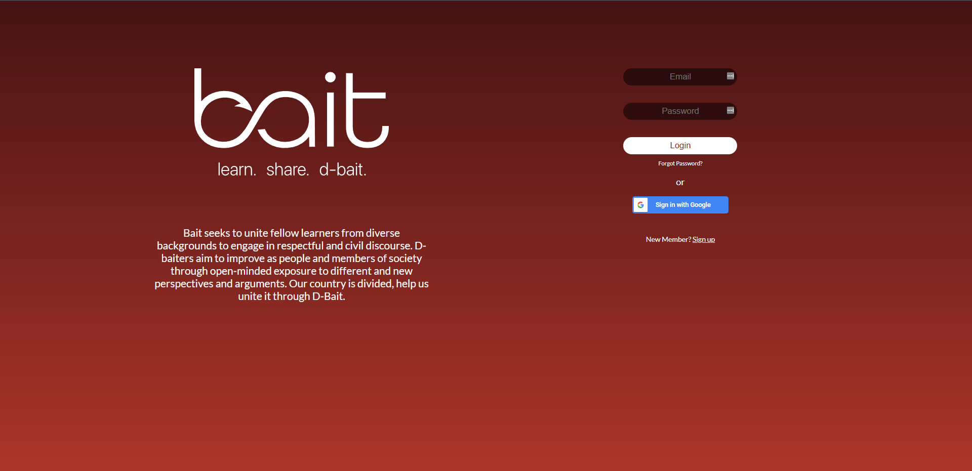 Bait is a website where users can create, share, spectate, and participate in debates about any topic they find interesting. It was originally created as a new form of social media, and was initially developed as an M.V.P. for the clients. It makes use of firebase's realtime database to enable users to debate on real time with each other, and its frontend design follows a mobile-first approach.